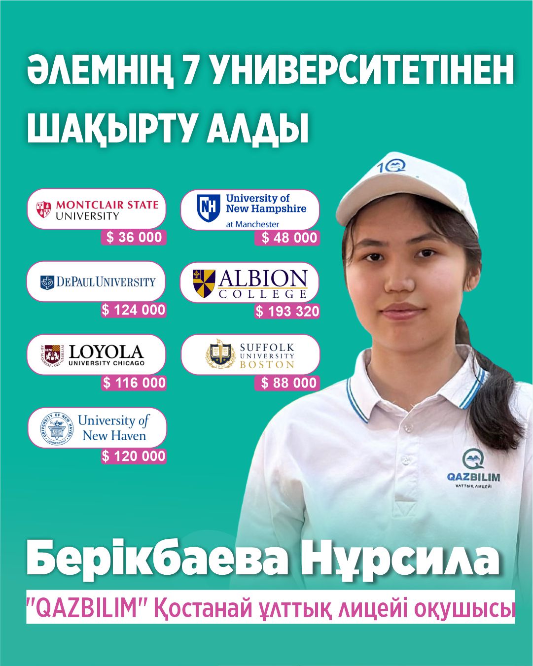 Қостанай қаласындағы QAZBILIM Қостанай ұлттық лицейінің 11 сынып оқушысы Нұрсила, әлемнің ең үздік жоғары оқу орындарынан білім алу мүмкіндігіне ие болып, үлкен жетістікке жетті. Жас дарын SAT емтиханын жоғары нәтижемен тапсырып, АҚШ-тың 7 үздік университетінен шақырту алды. Бұл Нұрсила үшін үлкен мүмкіндік ғана емес, Қазақстанның білім саласында қол жеткізген жетістіктерінің бір көрінісі.